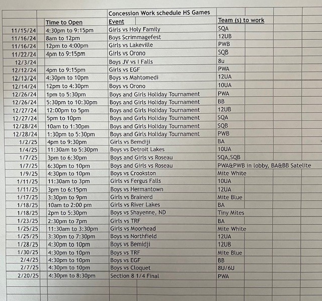 2024-2025 High School Concession Schedule